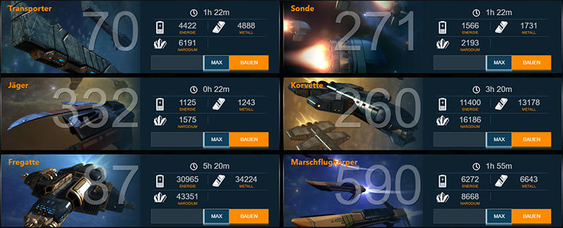 Neben dem Button "bauen" steht die Anzahl an Schiffe, die von diesem Typ bei den momentanen Rohstoffvorräten maximal gebaut werden kann. Durch einen Klick auf diese Zahl erscheint sie im Eingabefeld .