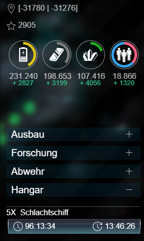 Wenn der Bau eines Schiffes aus Rohstoffmangel nicht möglich ist, wird unter der Dauer die Zeit angegeben, die noch verstreichen muss, damit unter den momentanen Bedingungen ein Bau möglich ist.