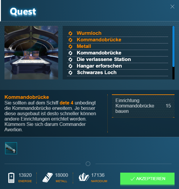 Bei der ersten Anmeldung wird der neue Kommandant über ein Klicktutorial in die Kommandobrücke zum Menüpunkt "Quests" geleitet.