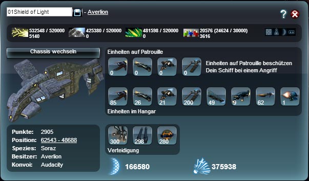 Außerdem wird eine Übersicht der Kennwerte, Rohstoffe und Einheiten des Schiffs angezeigt.