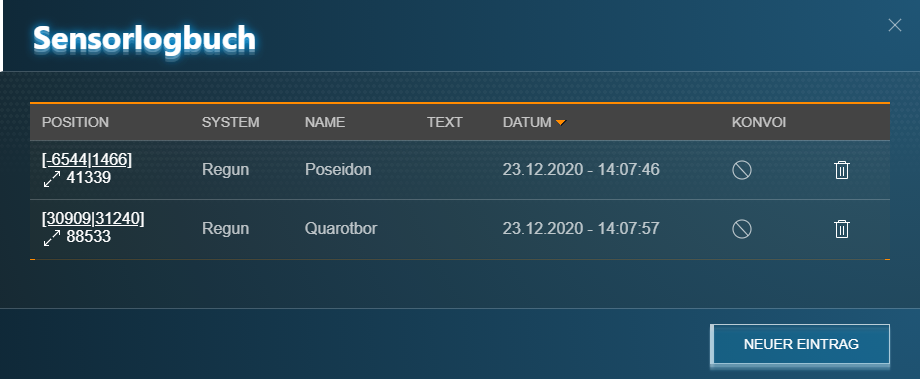 Um eine Position zu speichern an der sich weder ein Schiff noch ein Objekt befindet muss das Sensorlogbuch über die Kommandobrücke oder das Icon in der Karte geöffnet werden und dann manuell ein neuer Eintrag erstellt werden.